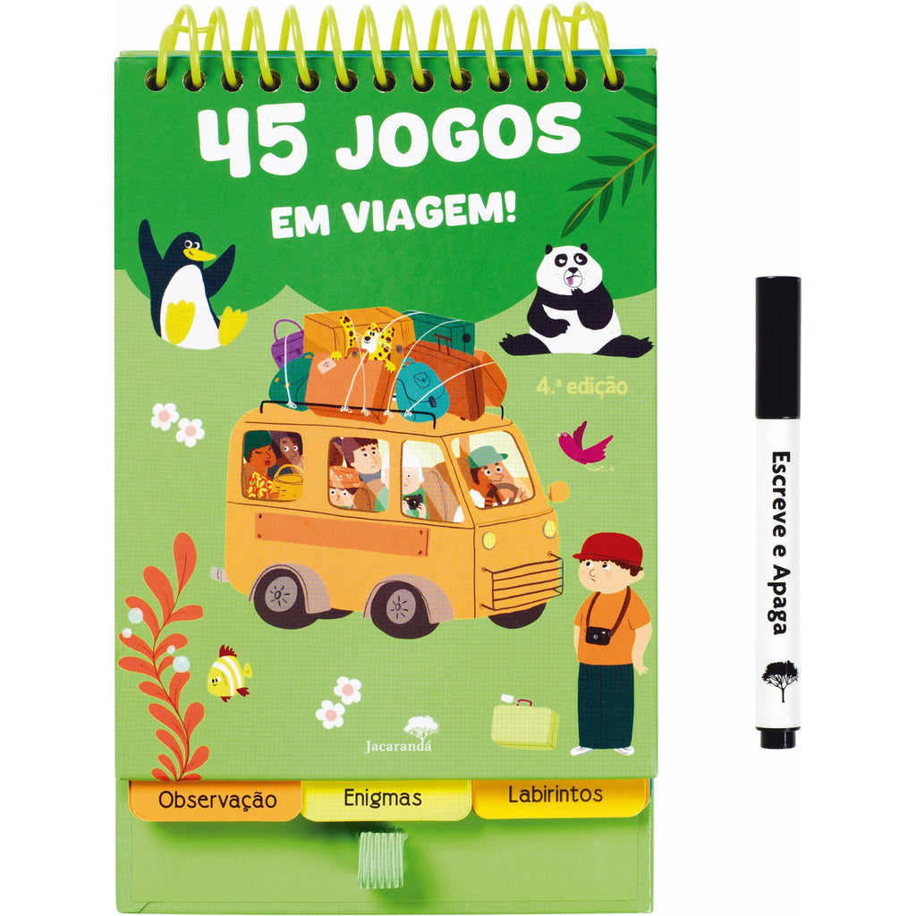 Sinopse:"45 jogos num livro com um formato prático para levares sempre contigo para te entreteres. Contém 15 jogos de observação, 15 enigmas, 15 labirintos e um marcador apagável. Este livro de atividades, edição dedicada a jogos em viagem, promove o controlo da caneta e a concentração."