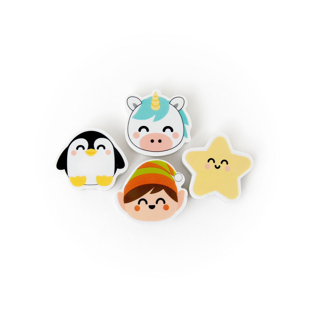 4 borrachas com formas natalícias (duende, unicórnio, pinguim e estrela)