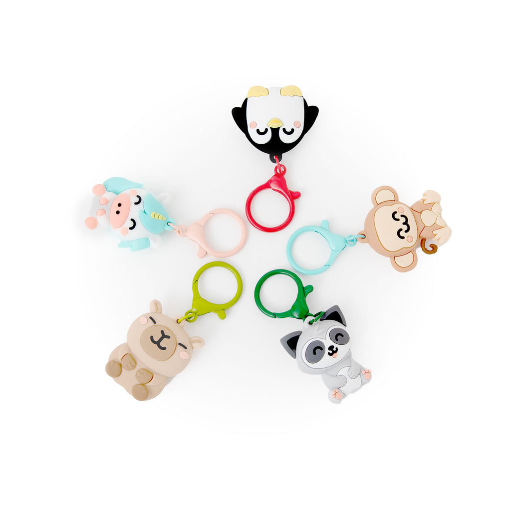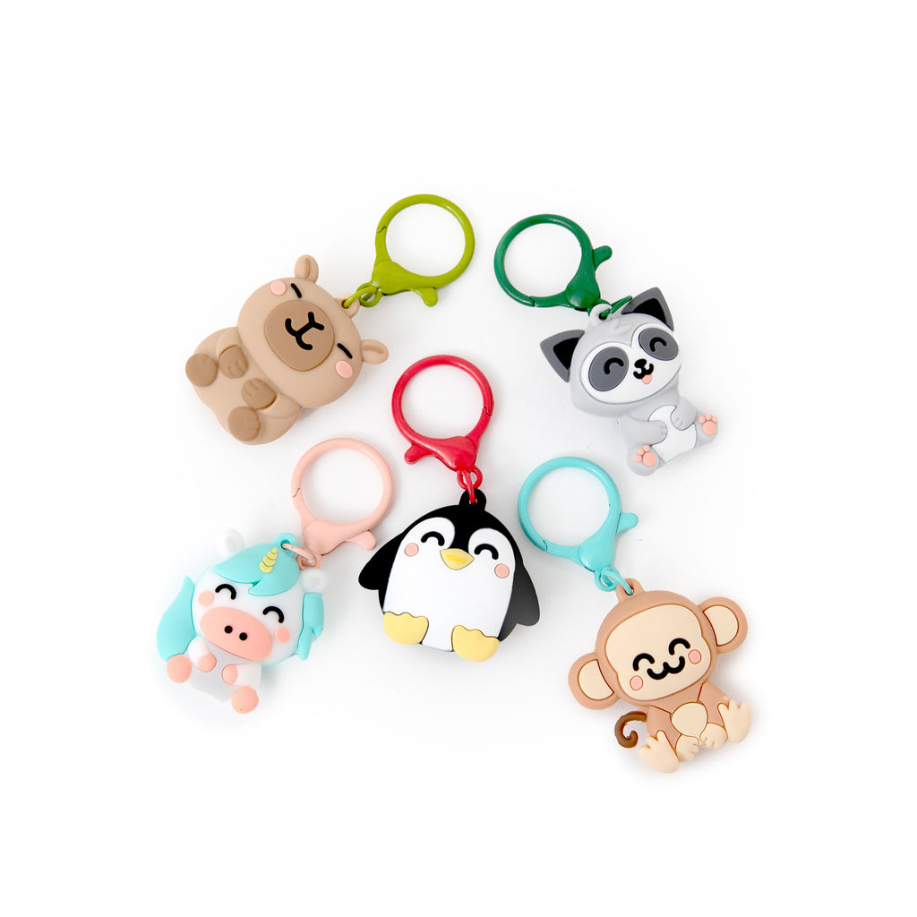 5 porta-chaves em borracha (macaco, pinguim, guaxinim, capivara e unicórnio)