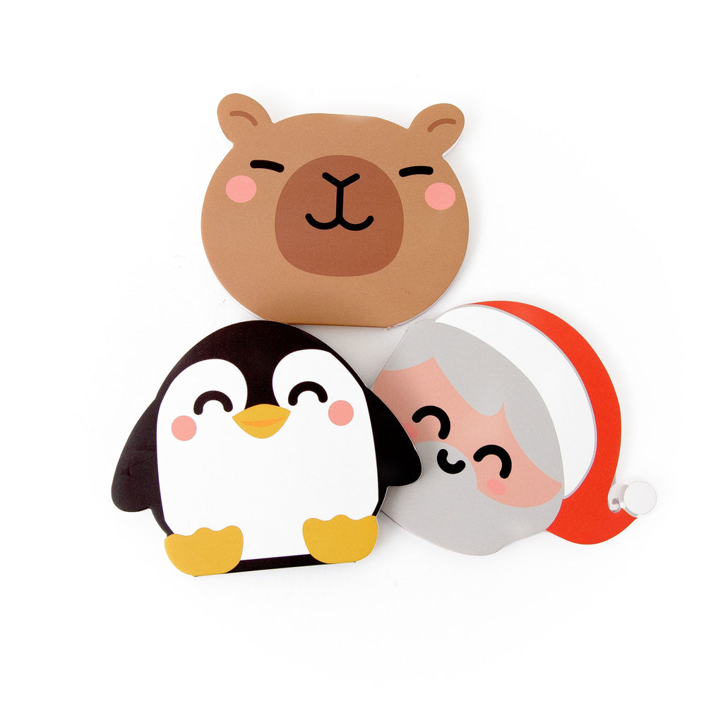 3 mini cadernos com formas (Pai Natal, capivara e pinguim)