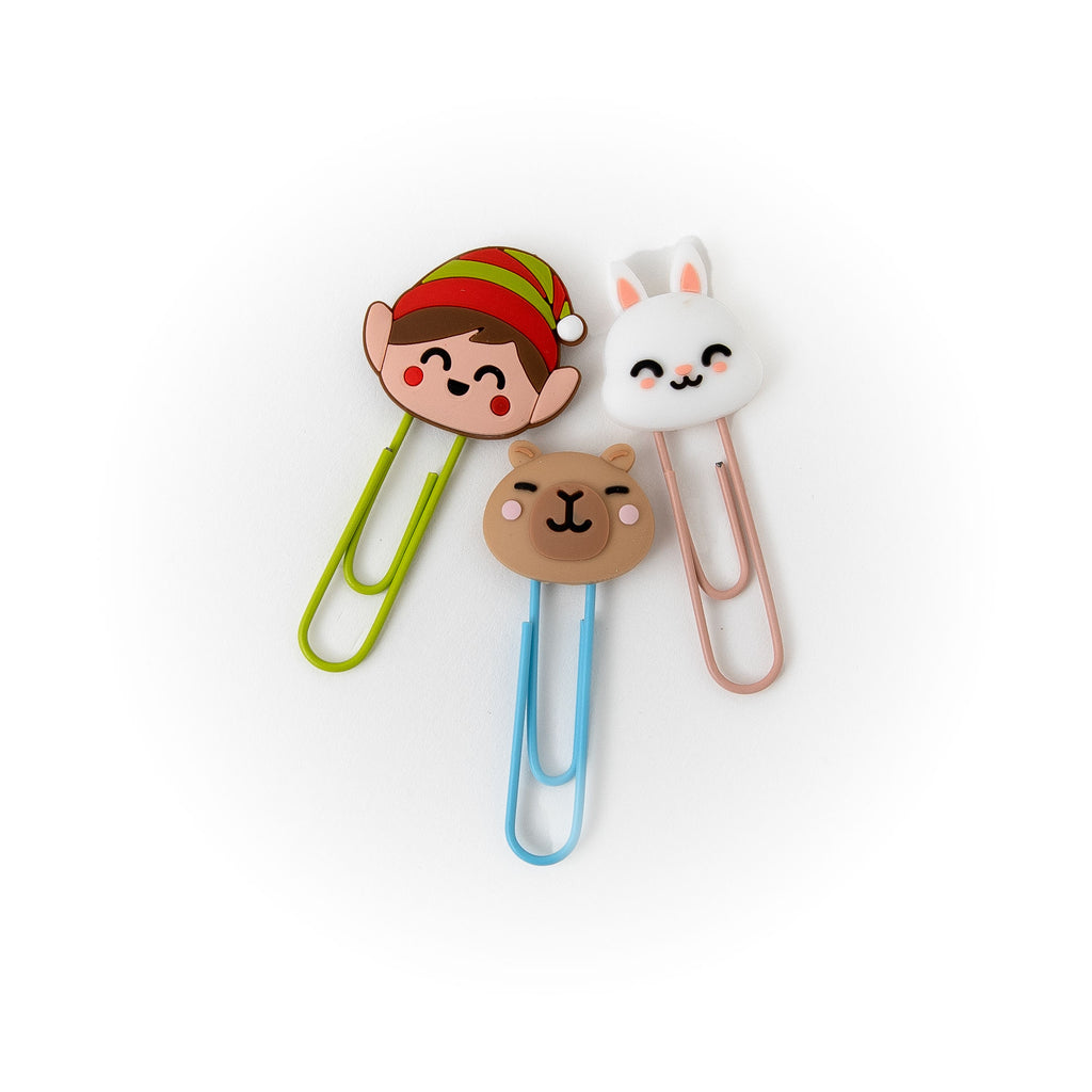 3 clipes de papel com personagens (duende, capivara e coelho)