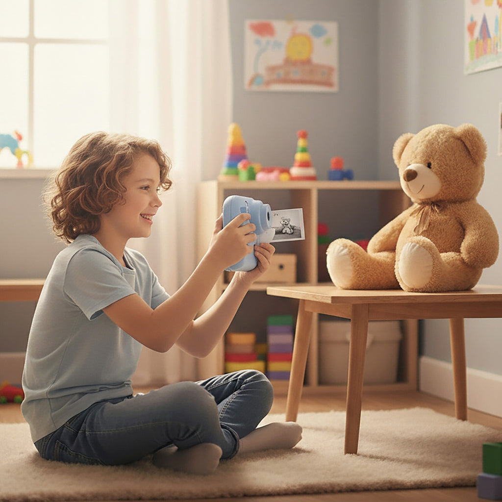 A Câmara Digital Infantil permite tirar fotos, selfies e vídeos de forma divertida, imprimindo instantaneamente em papel. Com filtros, molduras e jogos incluídos, transforma cada momento numa experiência criativa para as crianças. A Câmara Digital Infantil foi concebida para estimular a criatividade das crianças a partir dos 3 anos, combinando funcionalidades de fotografia, vídeo e impressão instantânea. O dispositivo permite capturar imagens e selfies, aplicar filtros e molduras, e imprimir fotografias em preto e branco diretamente da câmara, graças ao sistema de rolo de impressão integrado. Inclui ainda jogos interativos que tornam a experiência mais lúdica e envolvente. O design ergonómico e resistente foi pensado para mãos pequenas, garantindo facilidade de utilização e segurança.