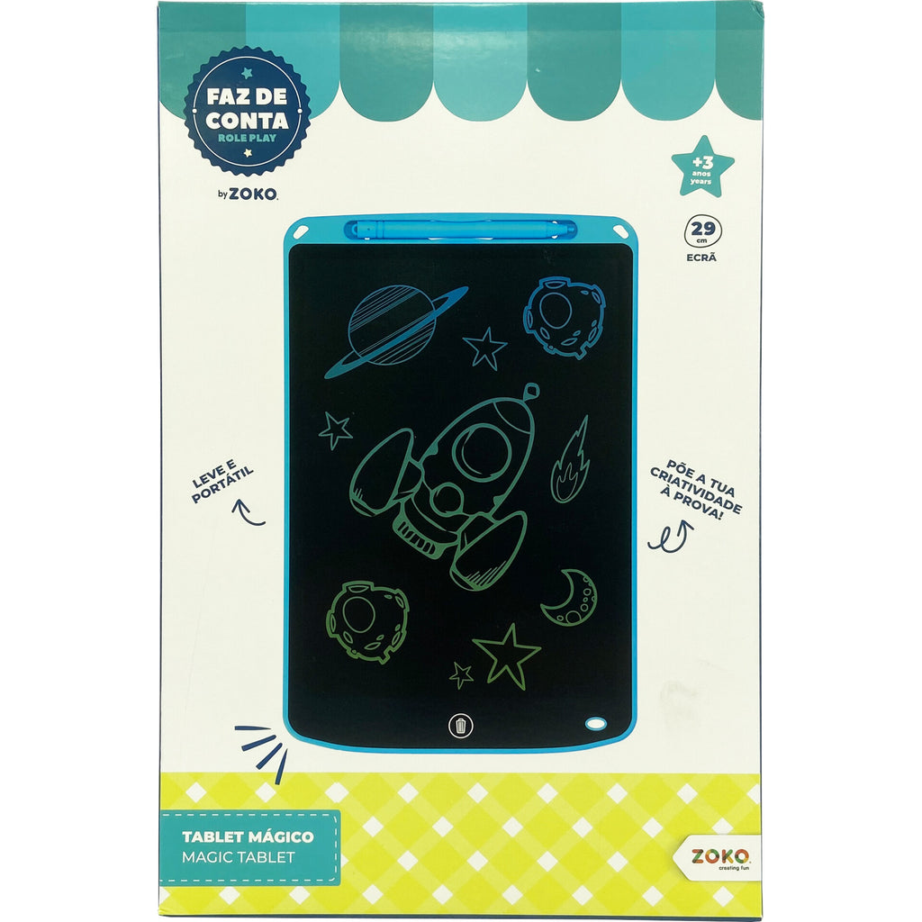 Tablet mágico com caneta. Leve e portátil, é perfeito para desenhar e escrever em qualquer lugar. Com um botão de apagar, capa de bateria e botão de bloquear, inclui ainda uma caneta e um ecrã de 30cm que oferece muito espaço para a imaginação fluir. A escolha perfeita para estimular a criatividade e o desenvolvimento das habilidades motoras dos pequenos artistas.