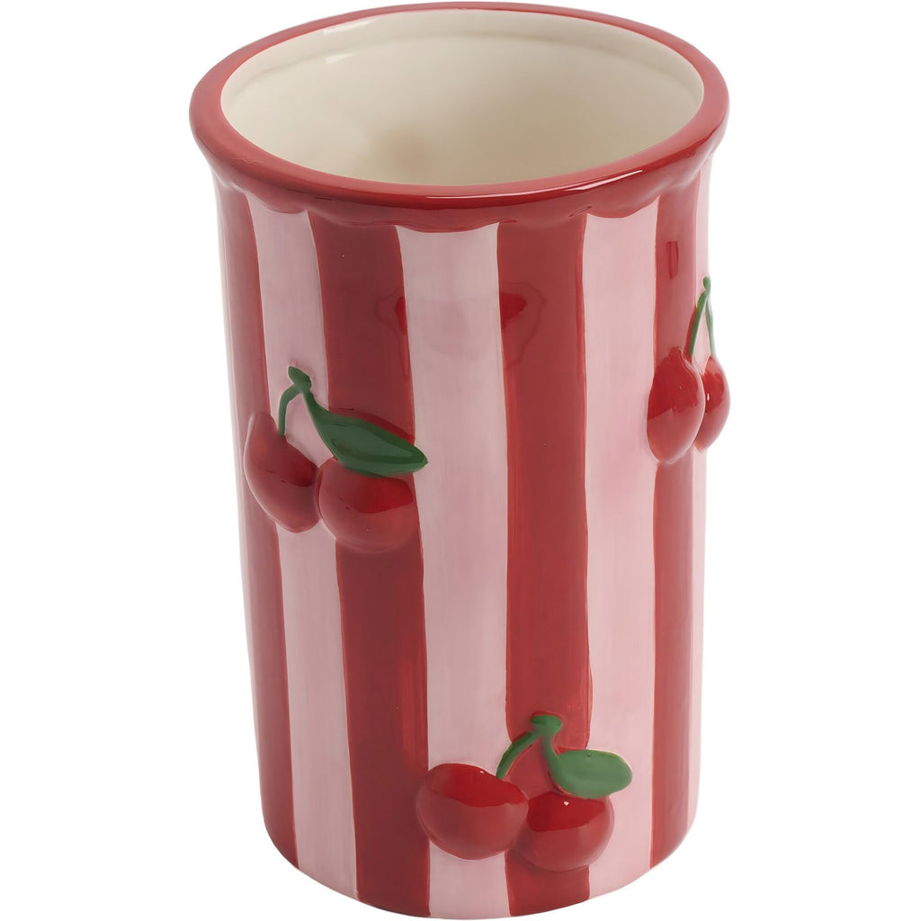 Dá um toque divertido, romântico e cheio de personalidade à tua decoração com esta jarra em cerâmica às riscas rosa, decorada com delicadas cerejas em relevo. Uma peça charmosa que combina cor, alegria e aquele look retro‑cute que transforma qualquer cantinho num espaço mais acolhedor.