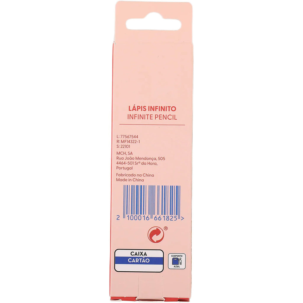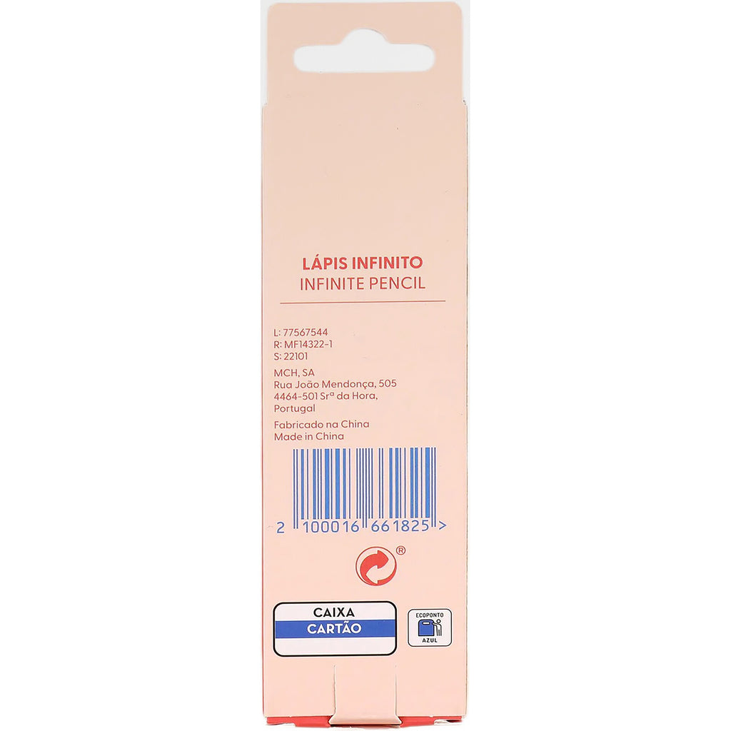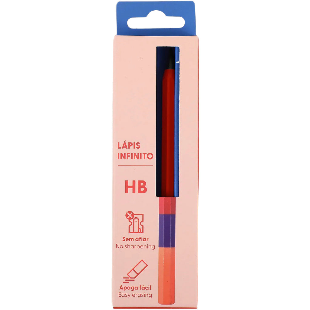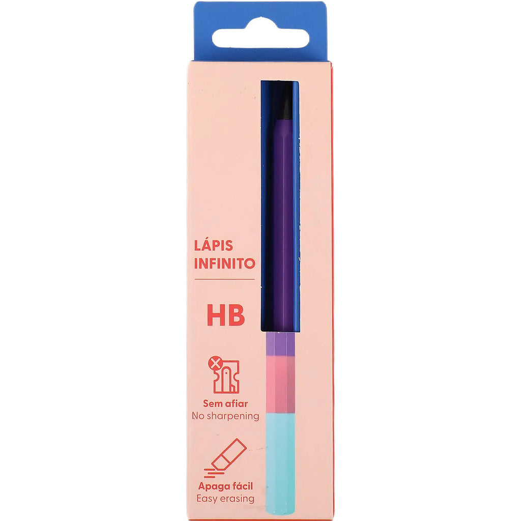 O lápis infinito junta inovação e estilo num só acessório, com corpo colorido e grafite que dispensa afiar para escrever sempre com suavidade. Apaga facilmente e oferece um toque criativo ao material escolar ou de escritório, tornando cada utilização mais prática e divertida.