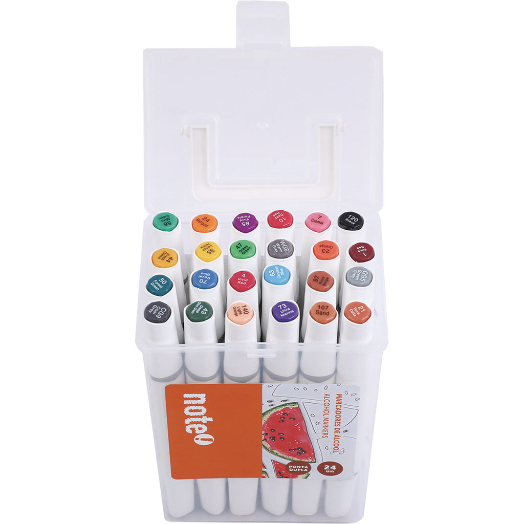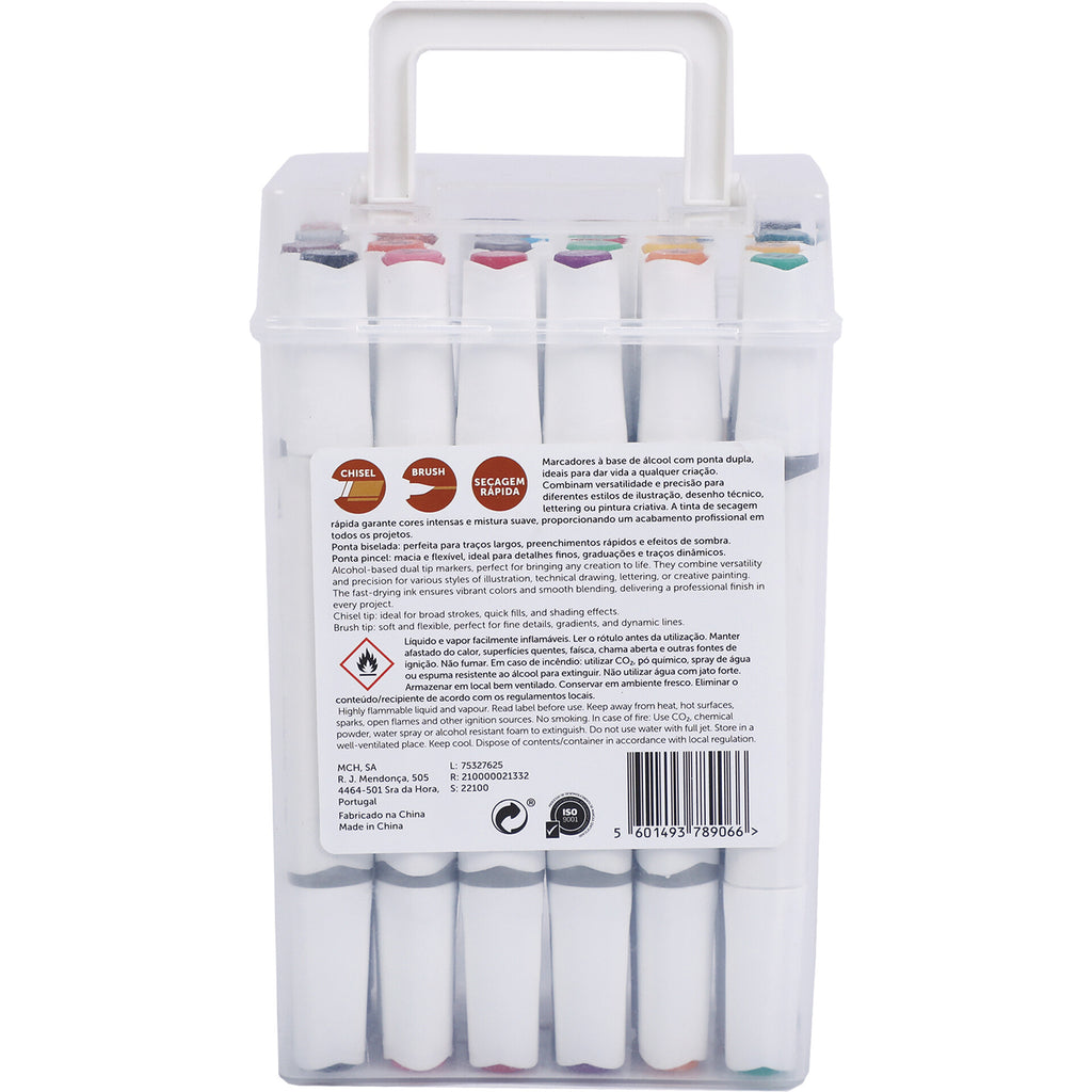 Conjunto de 24 marcadores com caixa à base de álcool com ponta dupla, ideais para dar vida a qualquer criação. A combinação da ponta biselada e da ponta pincel permite explorar diferentes estilos de ilustração, desenho técnico, lettering ou pintura criativa. A tinta de secagem rápida garante cores intensas, mistura suave e um acabamento profissional. A ponta biselada é perfeita para traços largos e preenchimentos rápidos, enquanto a ponta pincel, macia e flexível, permite detalhes finos, sombras e traços expressivos.