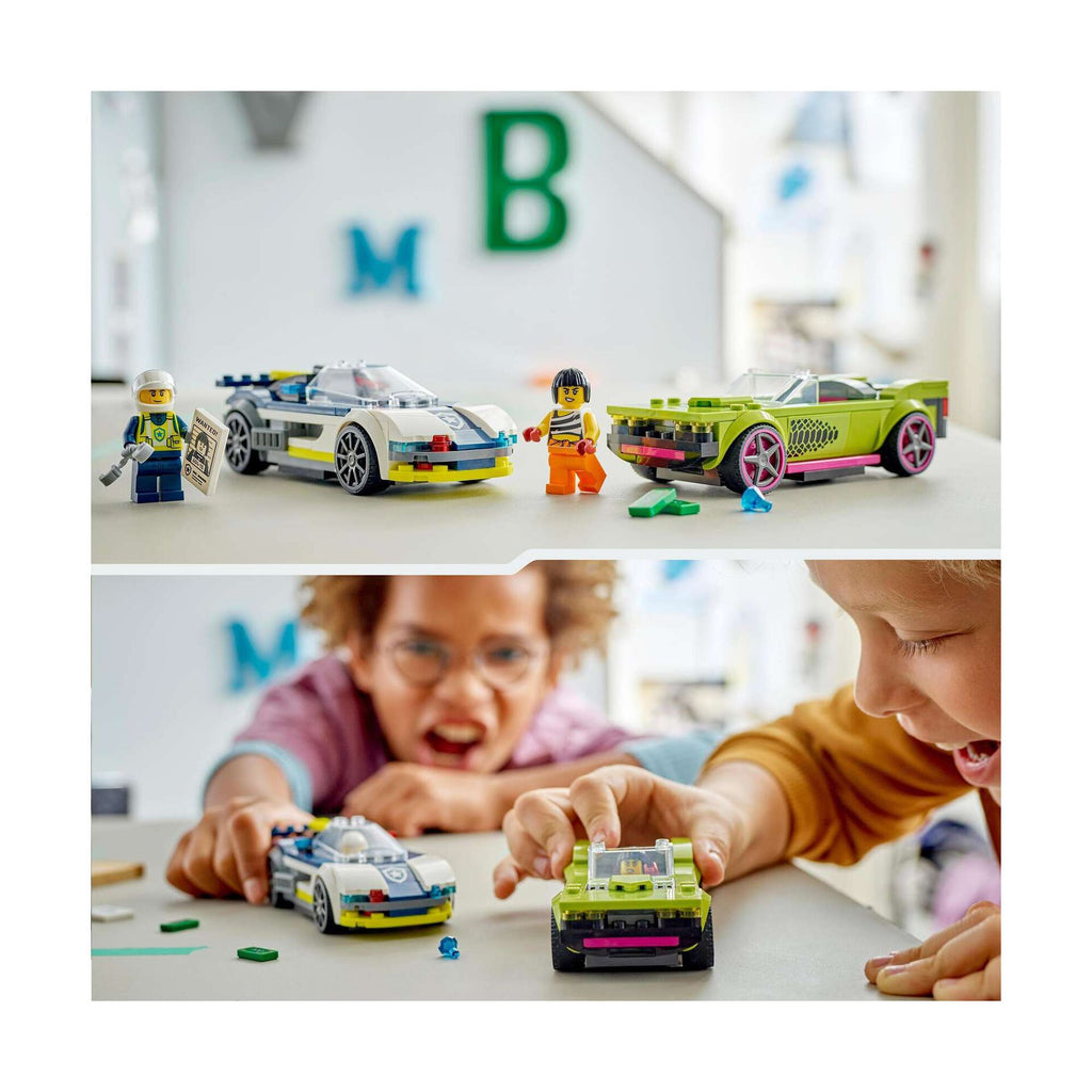 Dê azo à diversão a alta velocidade com o set do carro da polícia para crianças a partir dos 6 anos. O set LEGO City - Perseguição de Carro da Polícia a Muscle Car (60415) inclui um intercetor da polícia e um veículo de fuga, além do polícia e da bandida para criação de histórias e encenações divertidas. Este set inclui um guia de construção ilustrativo fácil de seguir e instruções digitais passo a passo na aplicação LEGO Builder. Leve os pequenos construtores numa aventura com este companheirode construção intuitivo. As crianças podem ver modelos em 3D enquanto constroem. A aplicação também permite acompanhar o processo de construção, além de explorar e guardar sets virtuais. A Sua Cidade, Sem Limites! Os sets LEGO City são ideais para as crianças fãs do faz de conta. As estruturas repletas de funcionalidades, veículos realistas e personagens inspiradoras permitem às crianças explorarem o mundo através de histórias e cenários que representam a vida de uma forma divertida e emocionante.
